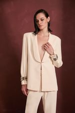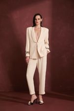 O Blazer Elle na cor Vanilla é confeccionado em tecido Patux com estrutura que valoriza a silhueta. A peça apresenta modelagem ajustada com mangas longas e ombreiras, criando um visual elegante e contemporâneo. O decote profundo traz sofisticação ao design, enquanto o detalhe de amarração lateral tipo corset adiciona um elemento marcante à peça. O comprimento na altura do quadril complementa o caimento estruturado do blazer.