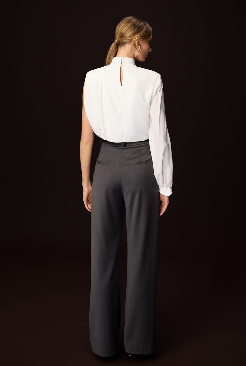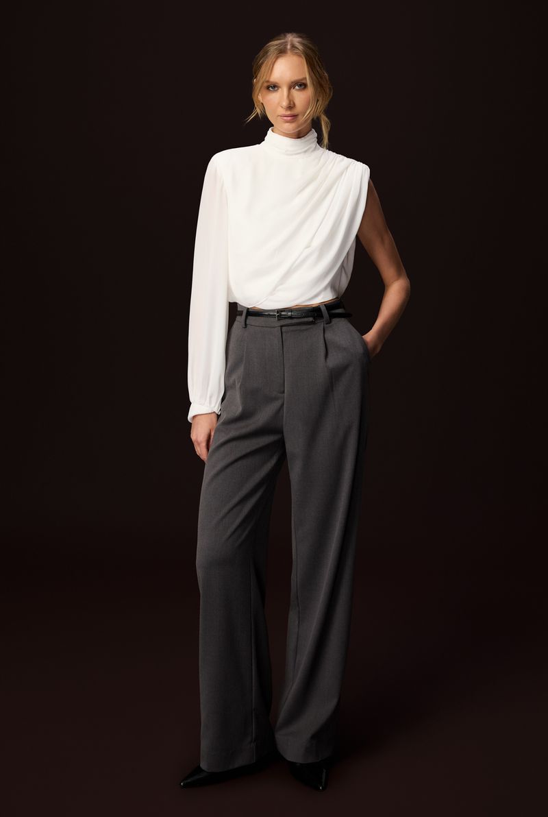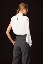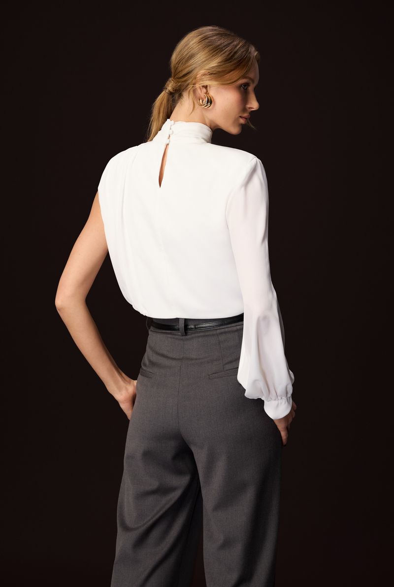 Confeccionada em crepe mousse, ela une fluidez e estrutura na medida certa. O grande destaque está na modelagem assimétrica, com uma manga longa em contraste ao ombro exposto, criando um visual moderno e elegante. A gola alta franzida complementa o design com um toque clássico e fashionista.