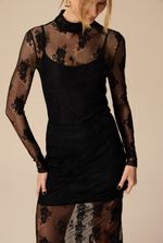 Feita em renda (lace), ela traz transparência estratégica e um acabamento refinado que valoriza qualquer produção. Na cor black, o preto aparece com elegância e atitude, equilibrando o romantismo do tecido com uma proposta moderna. A modelagem ajustada ao corpo destaca a silhueta de forma sutil, enquanto a gola alta e as mangas longas com detalhes rendados elevam o nível de sofisticação da peça. Use como protagonista em looks noturnos ou sobreposta a tops básicos para composições mais casuais e fashionistas!