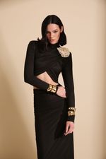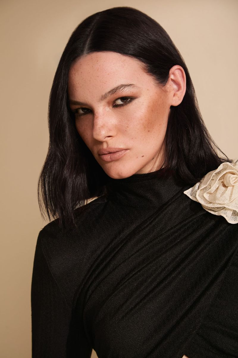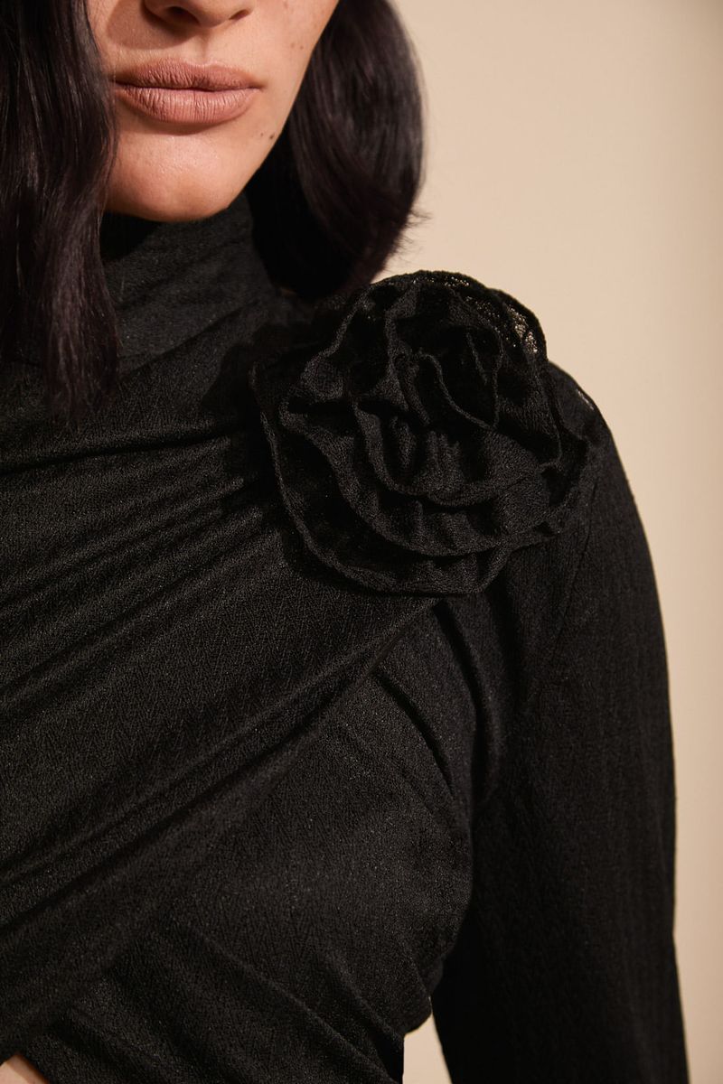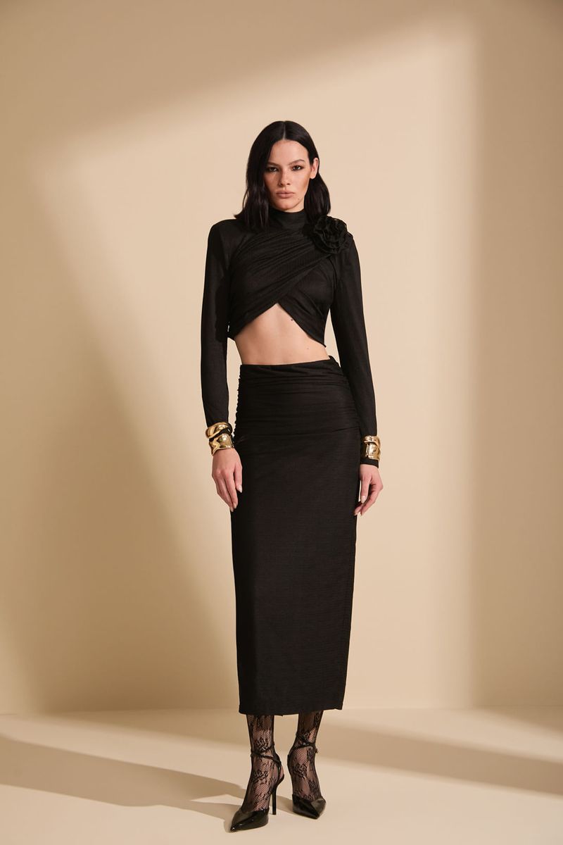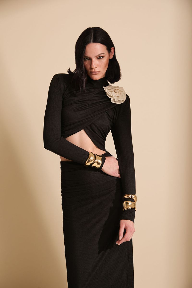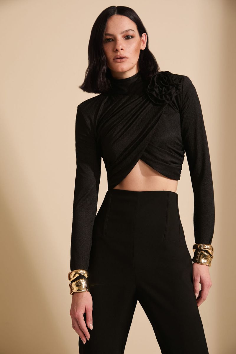 A Blusa na cor Black é confeccionada em laise crepe com elastano, proporcionando caimento ajustado e confortável ao vestir. A peça apresenta modelagem ajustada com mangas longas e gola alta, criando um visual elegante e contemporâneo. O recorte frontal com transpasse e o drapeado valorizam a silhueta e adicionam movimento ao design. O broche aplicado na produção das fotos não acompanha a peça e é vendido separadamente.