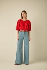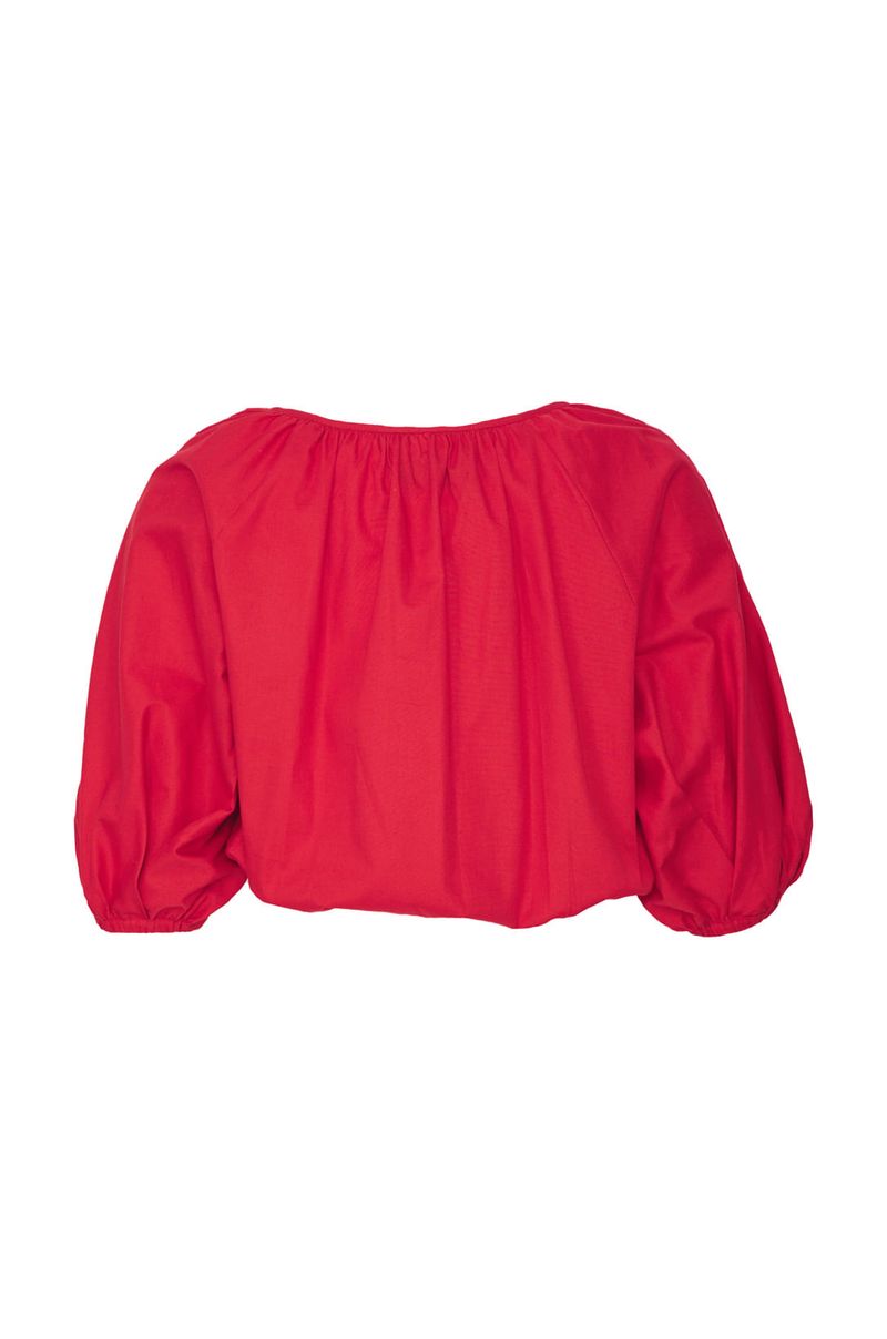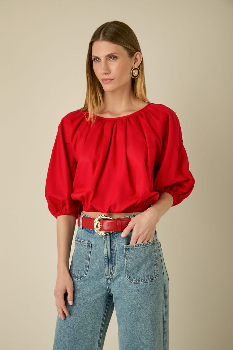 Confeccionada em tecido leve e macio, ela apresenta modelagem cropped com elástico na barra, garantindo ajuste confortável e valorizando a silhueta. As mangas bufantes 3/4 com elástico nos punhos criam um efeito volumoso e romântico, enquanto o decote amplo adiciona um toque descontraído. Na cor Bright Red, é a peça ideal para trazer vivacidade e energia aos looks, seja em combinações casuais ou produções mais sofisticadas.
