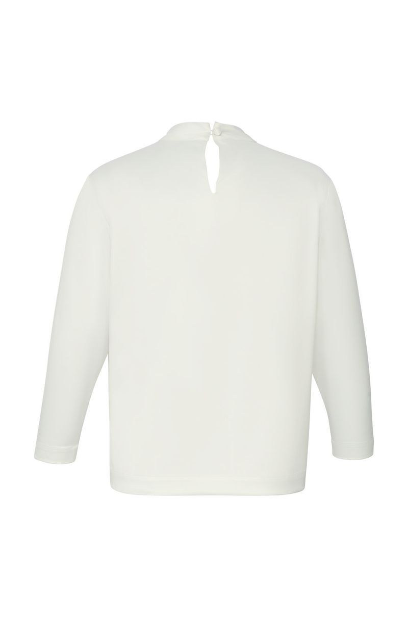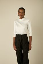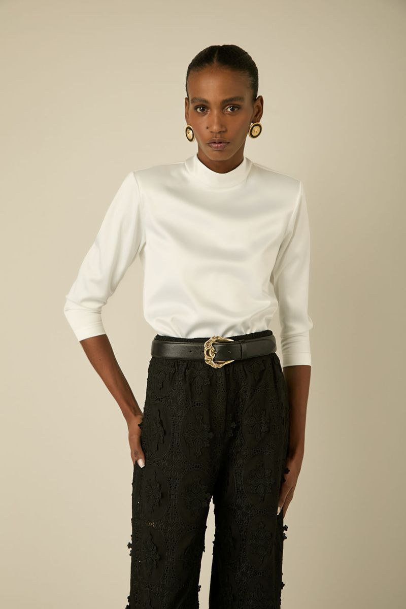 Confeccionada em tecido acetinado de toque suave, apresenta modelagem reta com gola alta e mangas 7/8, criando um visual sofisticado e minimalista. O caimento fluido valoriza diferentes tipos de corpo, enquanto a tonalidade neutra Off White permite combinações com peças estampadas ou coloridas, além de looks monocromáticos refinados. Ideal para compor produções para o trabalho, eventos sociais ou encontros especiais.