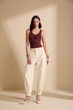 A Calça Alana é perfeita para composições modernas com toque fashionista. Confeccionada em sarja na cor vanilla, apresenta modelagem balloon com volume sutil nas pernas e barra levemente ajustada, criando uma silhueta contemporânea e cheia de estilo. A cintura alta valoriza o corpo, enquanto o caimento estruturado garante elegância e versatilidade para diferentes ocasiões.