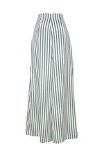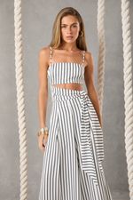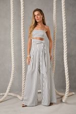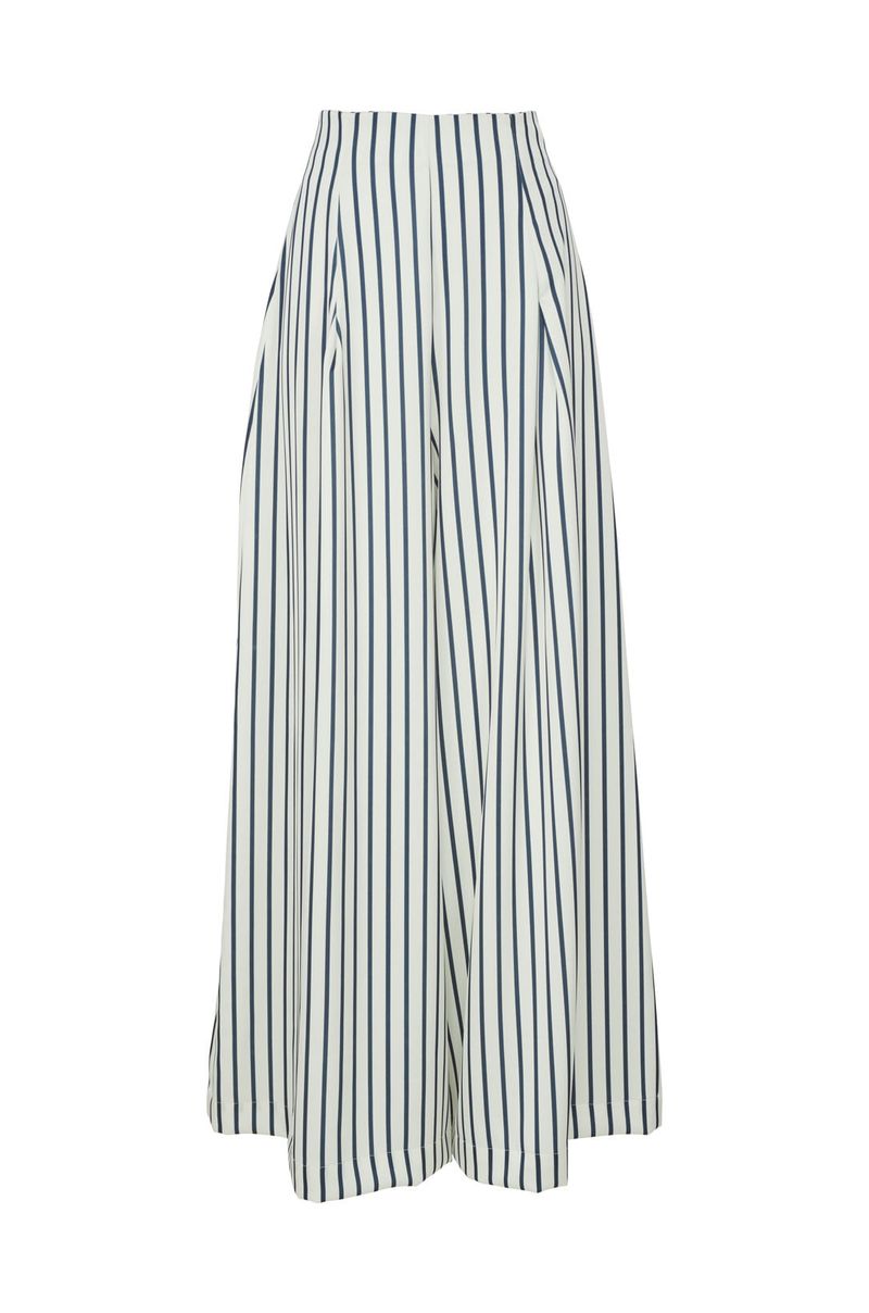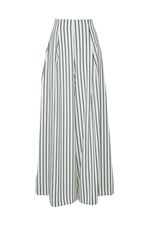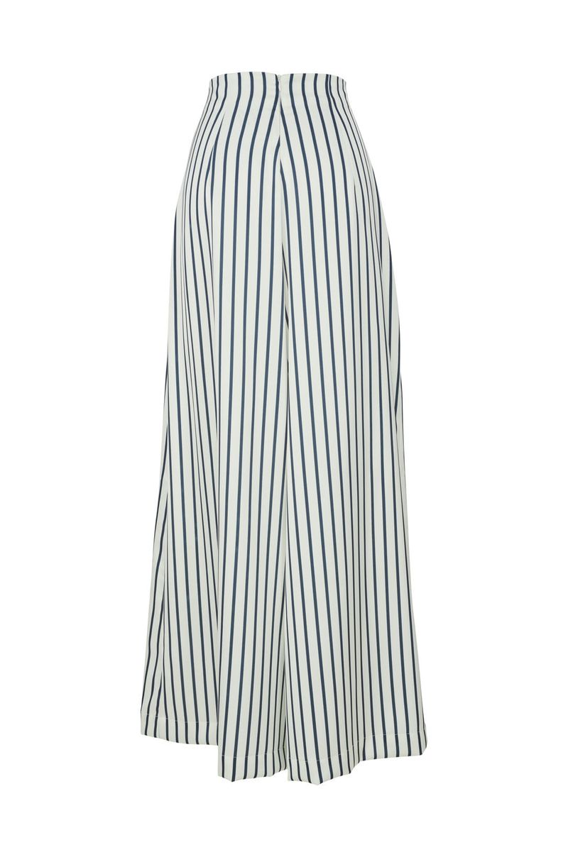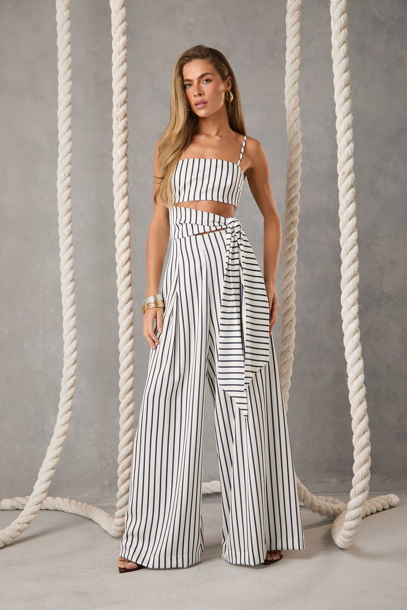 Confeccionada em crepe, ela possui modelagem ampla e cintura alta, garantindo movimento e fluidez ao caminhar. As listras verticais em white e navy blue alongam a silhueta e adicionam um toque sofisticado e contemporâneo ao visual. Ideal para composições fresh e estilosas, a peça transita facilmente entre produções casuais e looks mais elegantes. Combine com tops ajustados ou camisas de tecido leve para um look moderno e refinado.