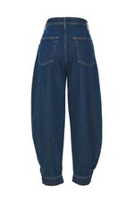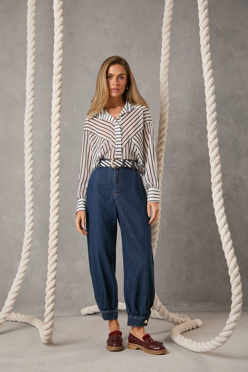 Confeccionada em jeans de alta qualidade, ela apresenta modelagem ampla e estruturada, que garante conforto e caimento impecável. As pregas na parte frontal e o ajuste na barra criam uma silhueta contemporânea e elegante, perfeita para compor produções cheias de personalidade.