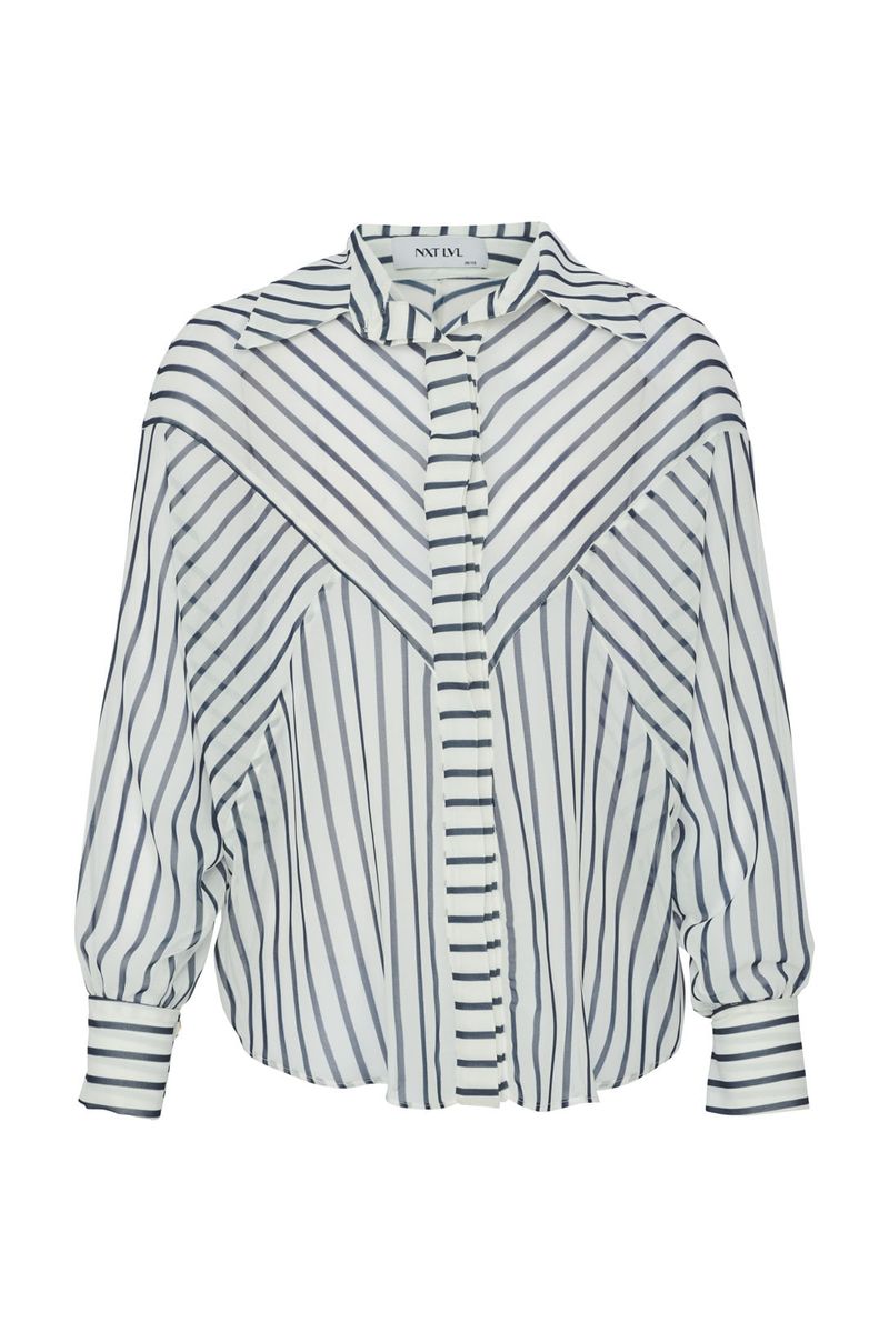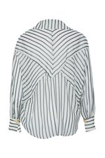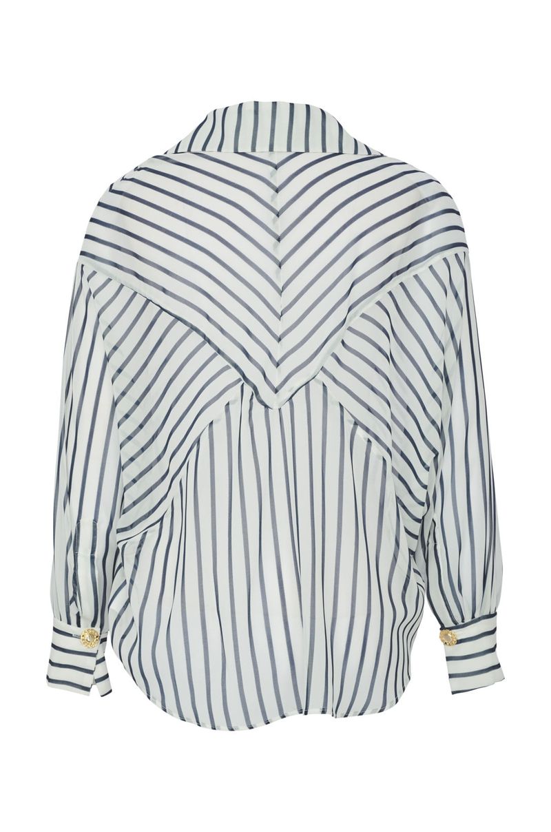 Confeccionada em chiffon leve e fluido, ela apresenta padronagem listrada em Navy Stripes, criando um visual sofisticado e contemporâneo. A modelagem ampla com mangas longas e punhos estruturados garante conforto e estilo, enquanto o recorte em “V” na frente valoriza o design da peça.