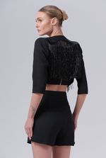 O casaco Demi é confeccionado em alfaiataria. A peça apresenta modelagem solta com franjas de brilhos anterior, proporcionando um visual glamouroso and fashion. Possui comprimento cropped, mangas 3/4, forro embutido, decote redondo com fechamento por colchete e acabamento pespontado. Peça com detalhes delicados, recomenda-se cuidado ao lavar.