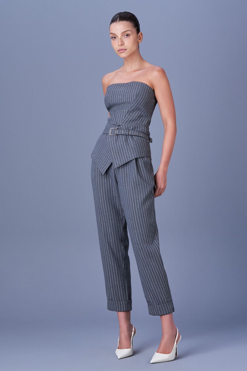 O cinto Poppy é confeccionado em tecido Gray Metallic. A peça apresenta modelagem estruturada com design inovador, agregando sofisticação ao look. Possui estampa de listras prateadas (Silver Stripes), fechamento ajustável por fivela metálica e sobreposição frontal que adiciona um toque moderno e elegante.