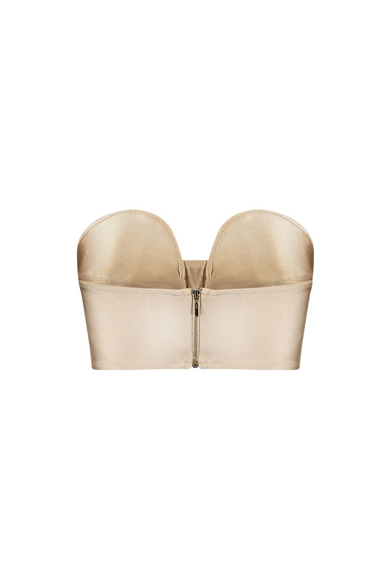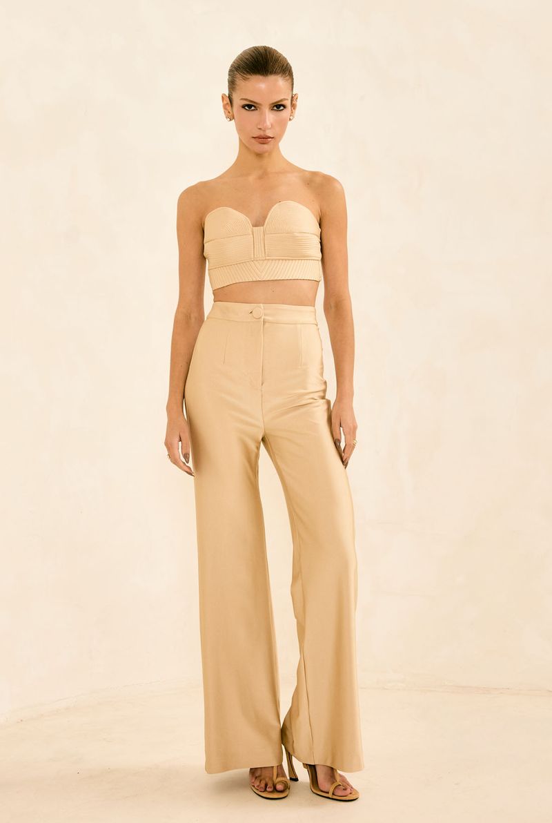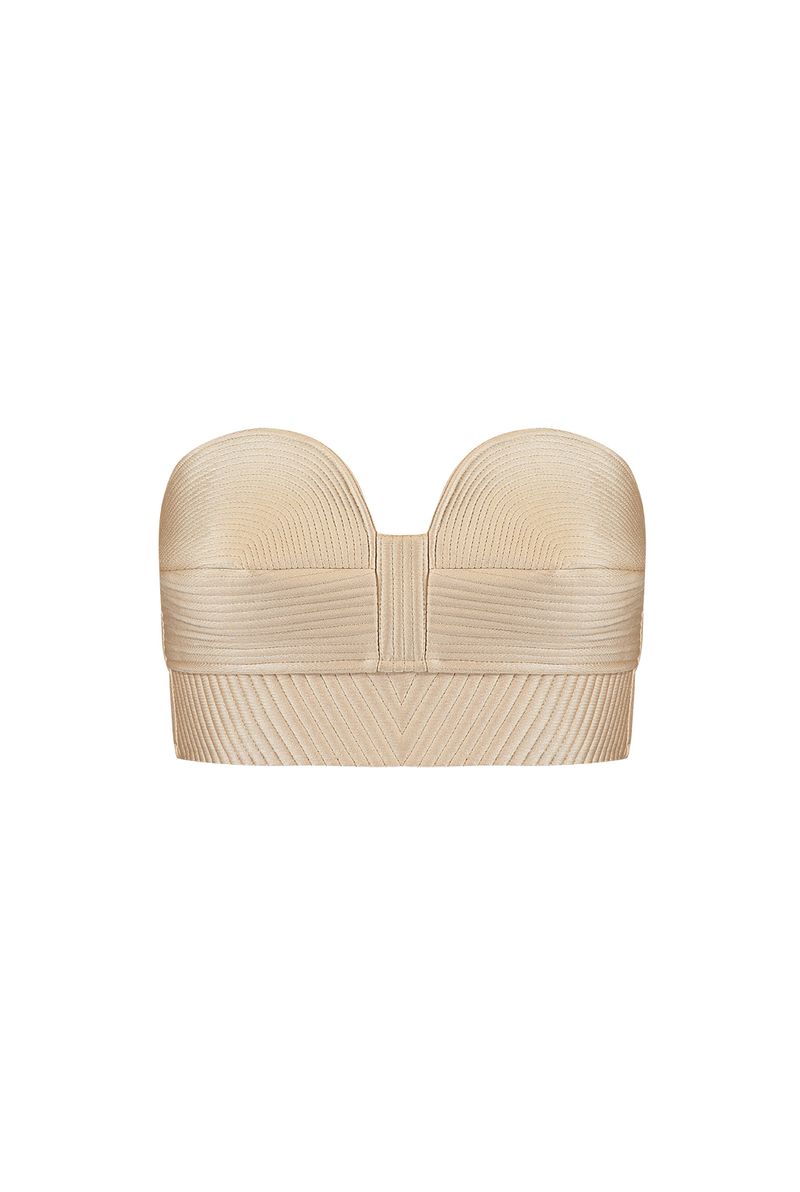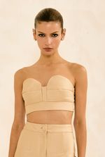Confeccionado em malha shine na cor Vanilla, ele apresenta modelagem estruturada com decote tomara que caia, realçando a silhueta de forma marcante e elegante. O recorte geométrico e o acabamento texturizado adicionam um toque fashionista, tornando-o perfeito para composições que unem estilo e versatilidade.