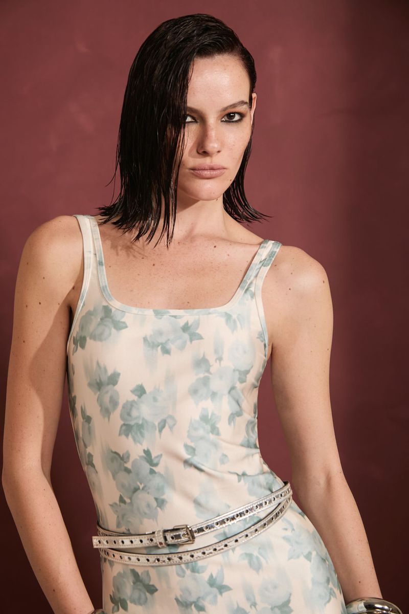 A Regata Alana Estampada na cor Dusty Roses é confeccionada em malha jersey shine estampada, proporcionando toque macio e leve elasticidade para maior conforto. A peça apresenta modelagem ajustada com alças largas e decote reto, valorizando a silhueta com um visual delicado e moderno. A estampa floral adiciona suavidade ao design, tornando a regata uma peça versátil para diferentes composições.