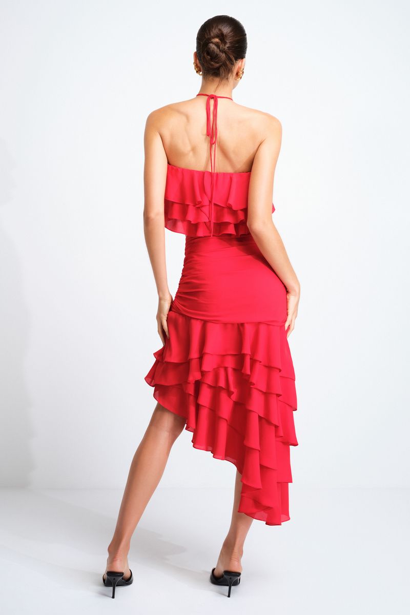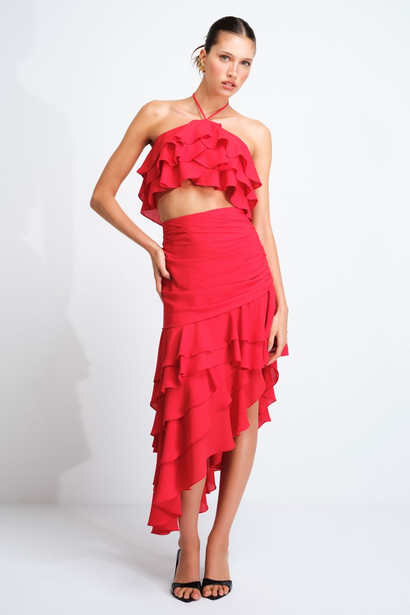 A Saia Giulia é confeccionada em crepe mousse. A peça apresenta cor rosso, modelagem ajustada na cintura e caimento que se abre em camadas assimétricas, criando um efeito fluido e elegante. O design destaca a silhueta de forma sofisticada, sendo ideal para composições que buscam um toque de movimento e sofisticação. É perfeita para ocasiões que exigem um visual marcante e estiloso.