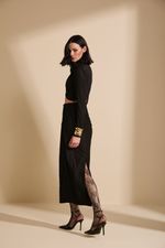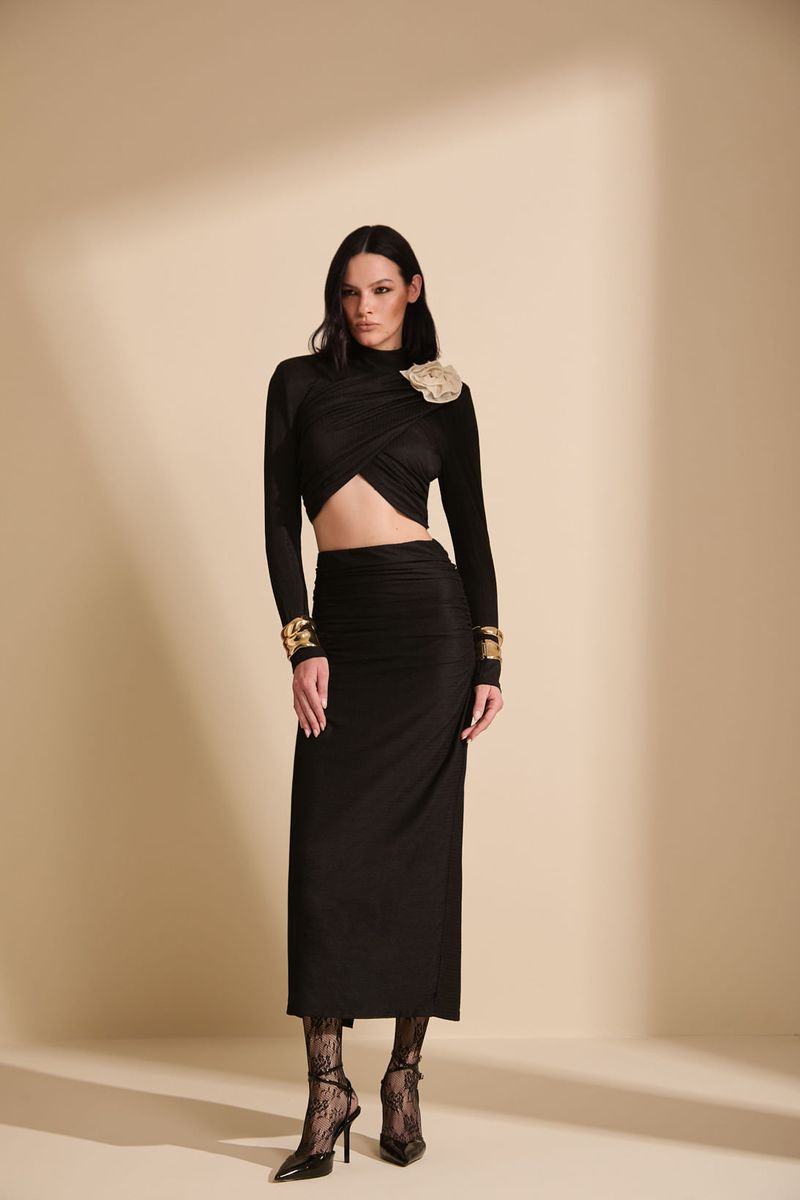 A Saia Midi na cor Black é confeccionada em laise crepe com elastano, proporcionando caimento ajustado e confortável ao vestir. A peça apresenta modelagem ajustada com cintura média que valoriza a silhueta. O drapeado lateral cria textura e movimento ao design, enquanto a fenda posterior garante mobilidade e adiciona um toque elegante e contemporâneo à peça. O comprimento midi reforça a proposta sofisticada e versátil.