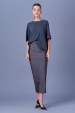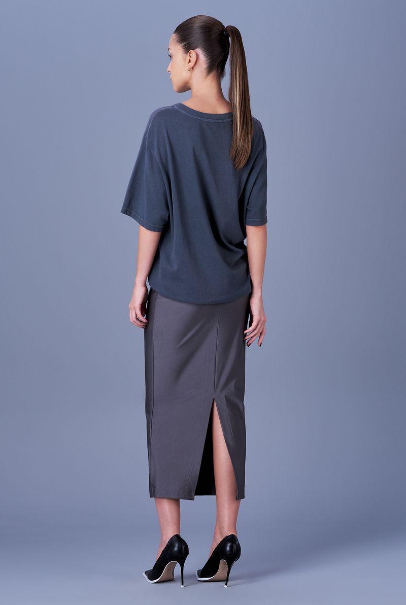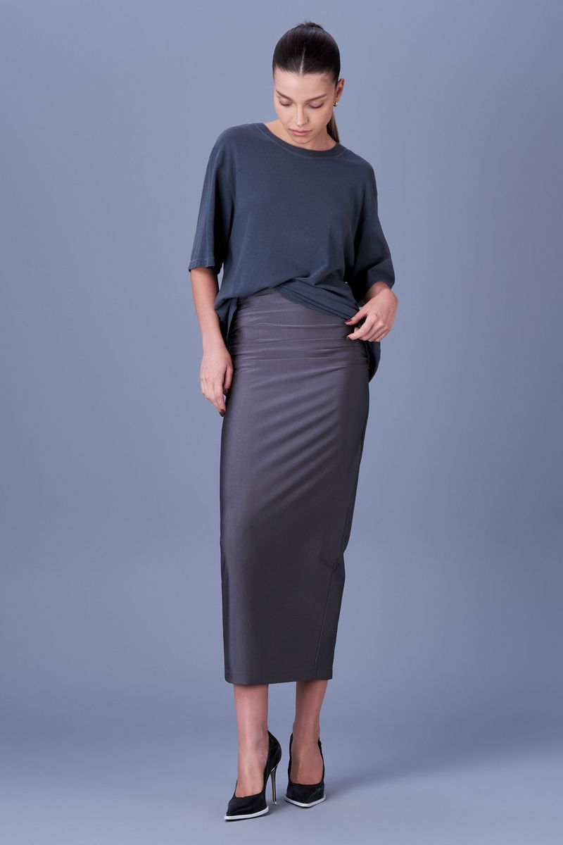 Possui cor Gray, comprimento midi e detalhe de franzidos sutis na região do quadril, valorizando a silhueta.