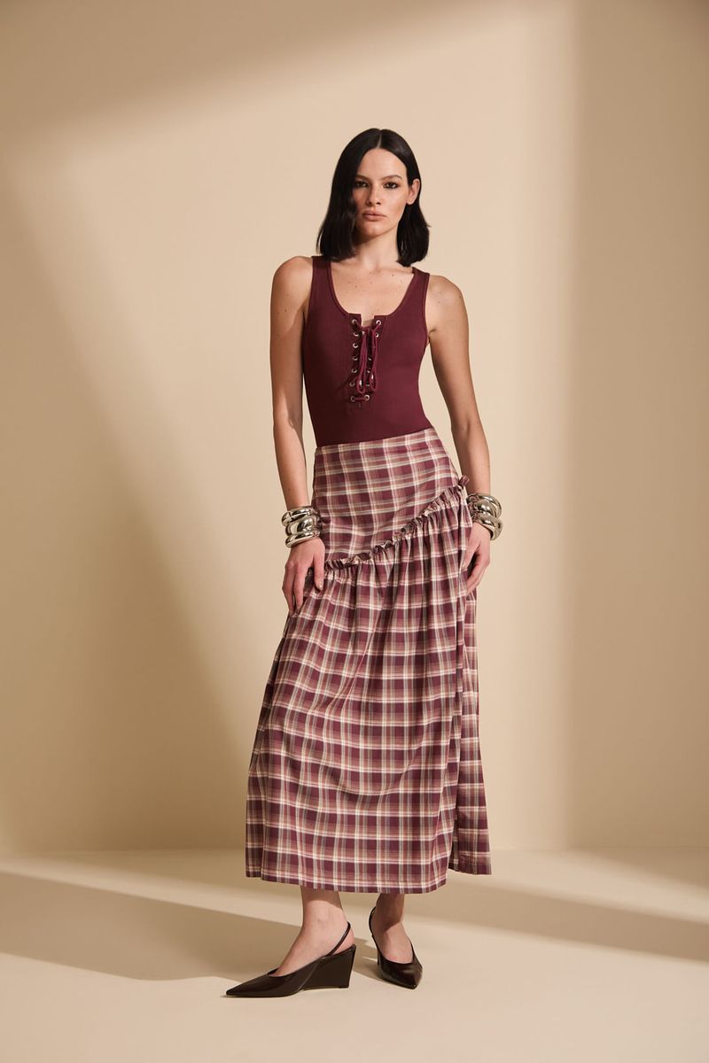 A Saia Midi Olivia traz um visual moderno com toque clássico através da estampa xadrez Square. Com caimento fluido e leve, a peça valoriza a silhueta com elegância e movimento. A modelagem midi evasê alonga de forma sutil, enquanto a cintura alta proporciona um ajuste confortável e sofisticado. Versátil, é ideal para composições que equilibram estilo contemporâneo e atemporalidade.