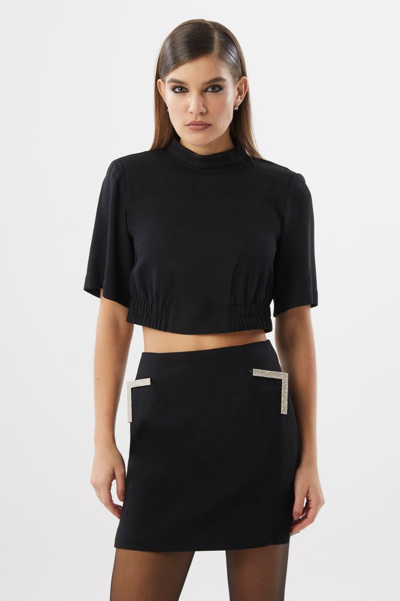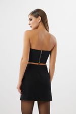 A saia Quinn é confeccionada em alfaiataria. A peça apresenta modelagem reta, comprimento curto e detalhes anterior em metal revestido em strass cristal, proporcionando um visual fashion e moderno. Possui forro embutido, cintura alta e zíper invisível posterior. Peça com detalhes delicados, recomenda-se cuidado ao lavar.