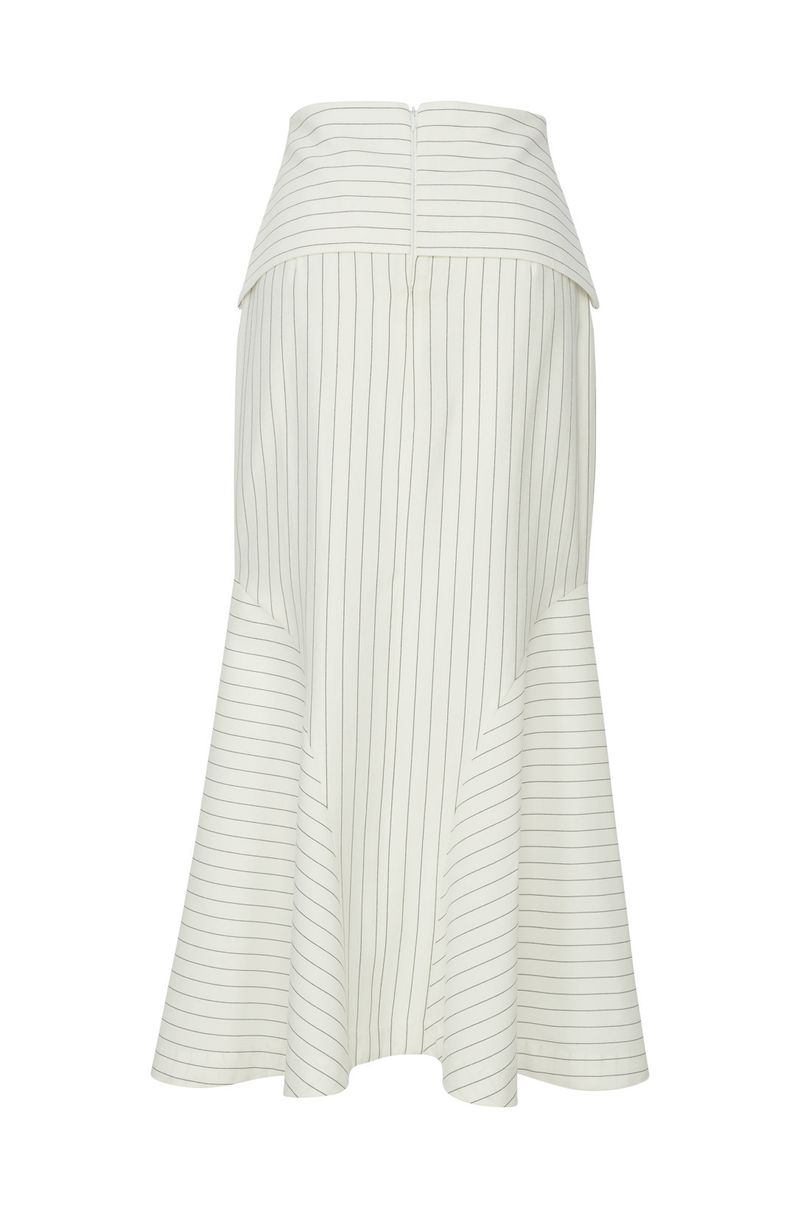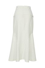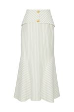 Confeccionada em tecido leve com estampa Navy Stripes, ela traz uma modelagem longa e levemente evasê que valoriza a silhueta. O cós estruturado com detalhe frontal em sobreposição e botões dourados adiciona um toque fashionista e sofisticado, enquanto as listras verticais e diagonais criam um efeito visual alongador. Versátil e atemporal, é ideal para compor produções que vão do dia à noite com muito estilo.