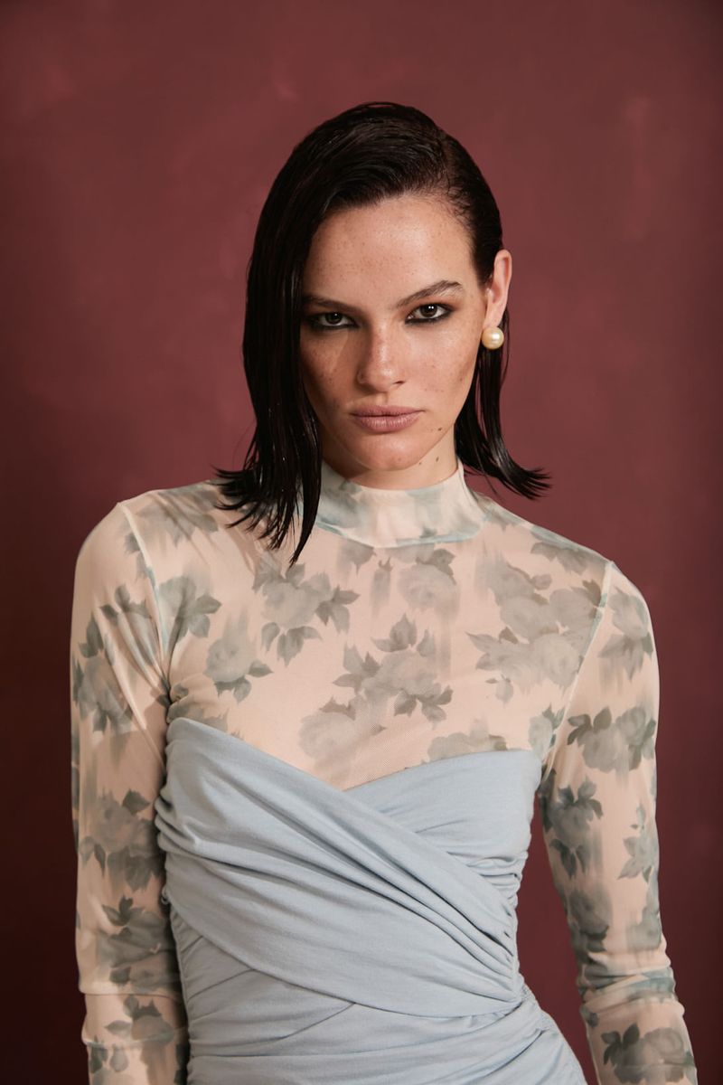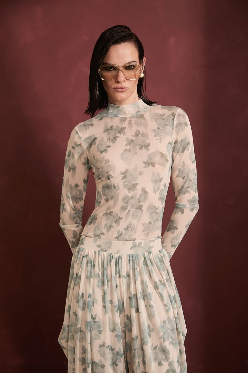 A Segunda Pele Julie Estampada na cor Dusty Roses é confeccionada em tule poliéster GH estampado com leve elasticidade, proporcionando conforto e ajuste ao corpo. A peça apresenta modelagem ajustada com mangas longas e gola alta, criando um visual delicado e moderno. A estampa floral traz leveza ao design, tornando a peça ideal para composições em sobreposição ou para ser usada como destaque no look.