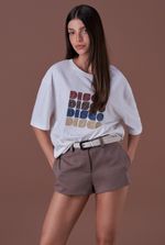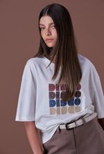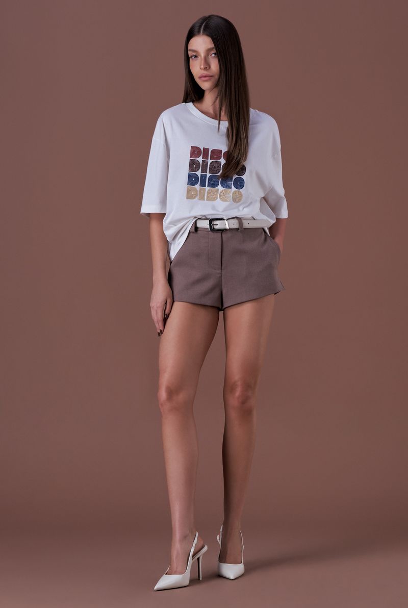 Possui estampa frontal com a palavra "DISCO" repetida em tons degradê, trazendo um toque retrô e estiloso.