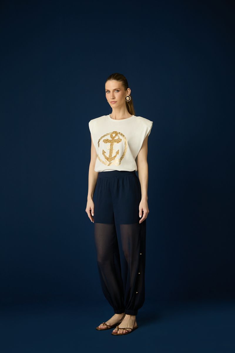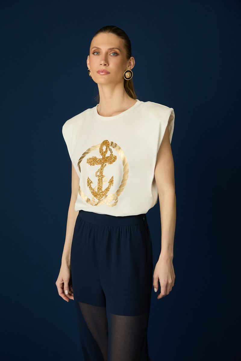 A T-shirt Tilda é a peça chave para um look cool e descomplicado! Feita em malha leve de algodão, ela traz uma modelagem reta com ombros marcados e um toque fashionista ao visual. A estampa em paetês dourados de âncora com corda náutica traz personalidade e um ar moderno à produção. O tom Off white nos detalhes reforça a inspiração navy, perfeita para composições urbanas com um charme sofisticado. Ideal para combinar com jeans ou saias midi, garantindo um look estiloso e atual para o verão!