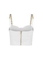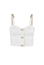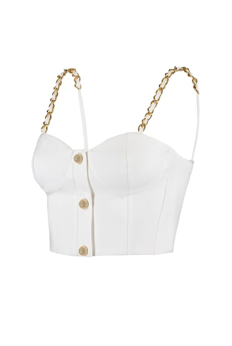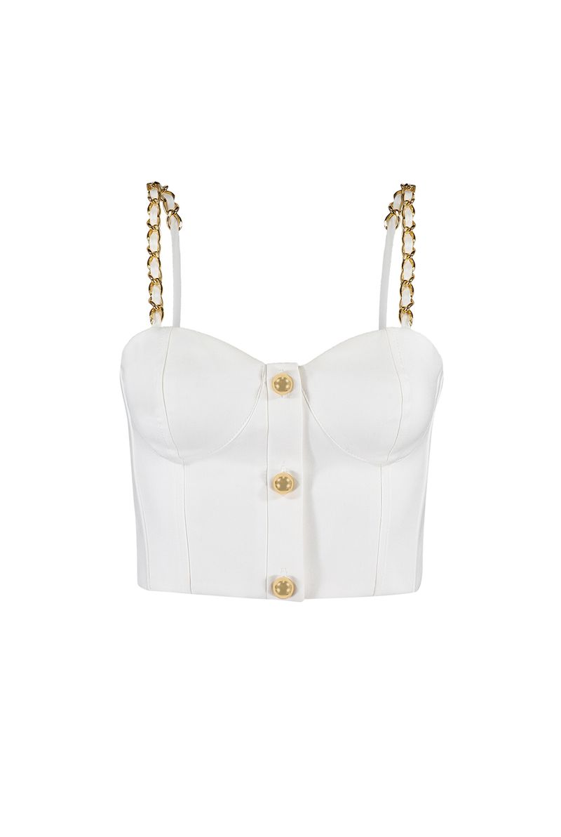 O Top Lila é a escolha perfeita para um visual ousado e sofisticado! Confeccionado em tecido estruturado na cor Off White, ele conta com modelagem ajustada que valoriza a silhueta, recortes que delineiam o busto e um toque glamouroso com os botões dourados frontais. As alças com correntes metálicas trazem um charme contemporâneo e fashionista, ideal para compor produções poderosas do dia à noite. Use com alfaiataria ou jeans de cintura alta para um look elegante e moderno em qualquer ocasião!