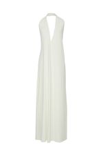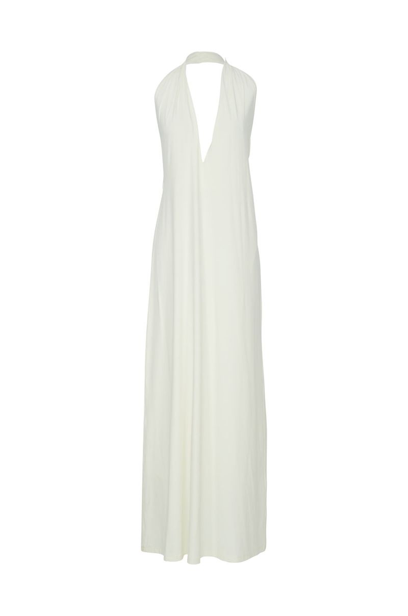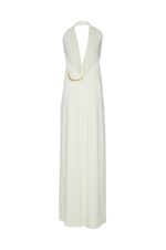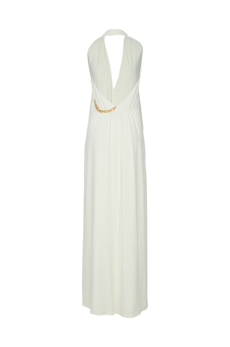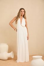 Seu decote profundo halter é o grande destaque da peça, valorizando o colo com delicadeza e imponência. Na cintura, o detalhe com argola metálica adiciona charme contemporâneo e cria um drapeado suave que harmoniza a silhueta.