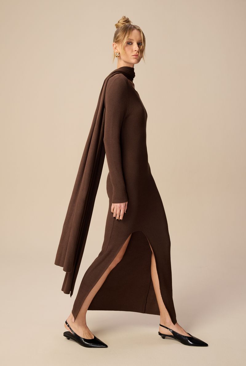 Confeccionado em tricot na cor Brown, ele apresenta uma modelagem longa com fenda frontal que traz sensualidade na medida certa. O detalhe de amarração lateral valoriza a cintura e adiciona um toque moderno ao visual. Com mangas longas e caimento ajustado ao corpo, o vestido une conforto e elegância, sendo ideal para eventos ou produções urbanas com uma pegada fashion. A textura do tricot confere sofisticação, enquanto o design minimalista garante versatilidade para diversas ocasiões.