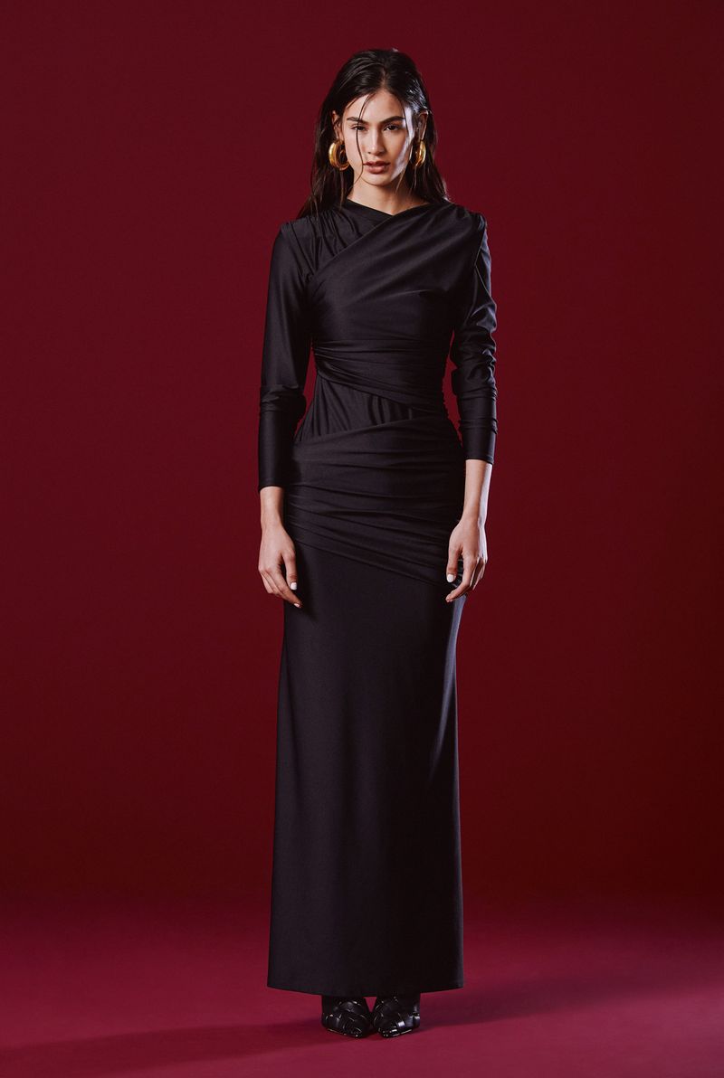 Com uma modelagem ajustada ao corpo, o vestido destaca a silhueta com elegância. Seu decote assimétrico drapeado adiciona um toque de modernidade, enquanto as mangas longas garantem um ar refinado. O tecido fluido proporciona conforto e um caimento impecável. Na cor Black, ele se torna ainda mais versátil e sofisticado, ideal para eventos formais e ocasiões especiais. O Vestido Kylie combina sofisticação e estilo para um visual marcante.