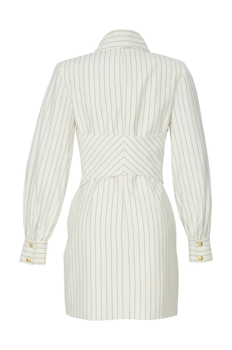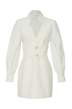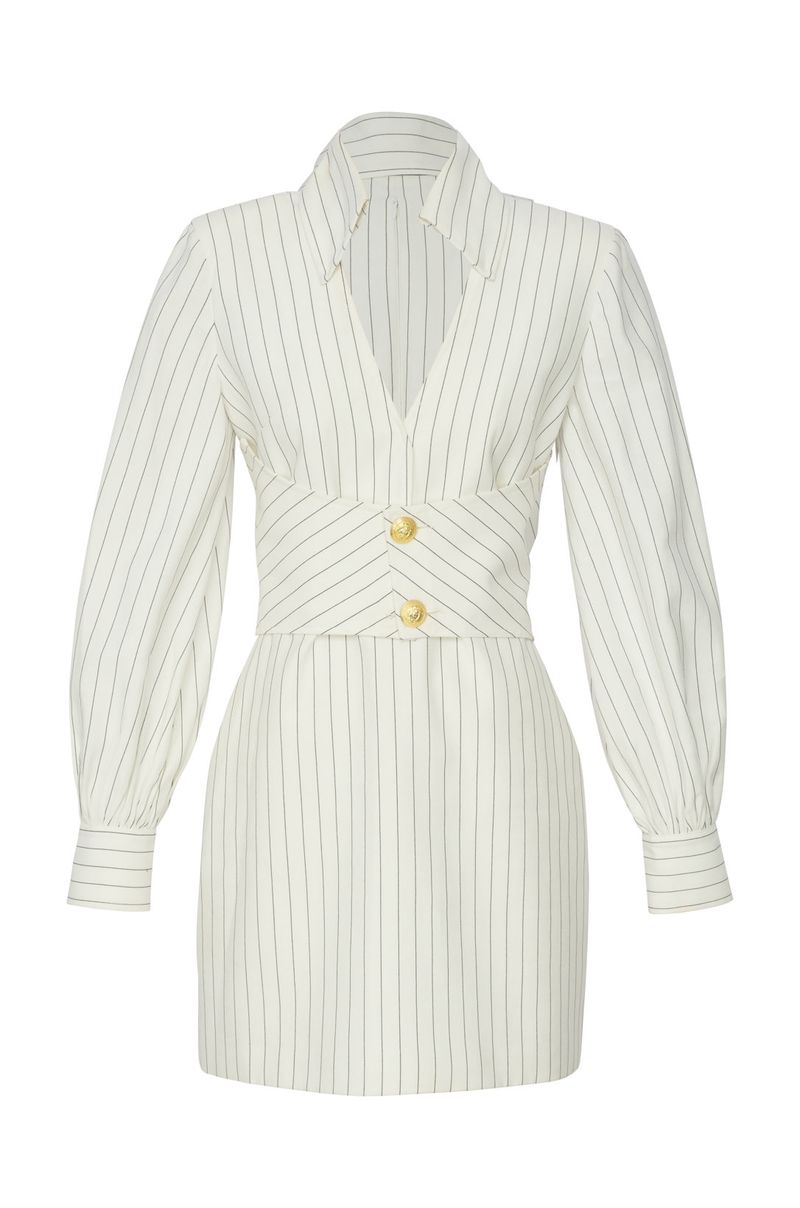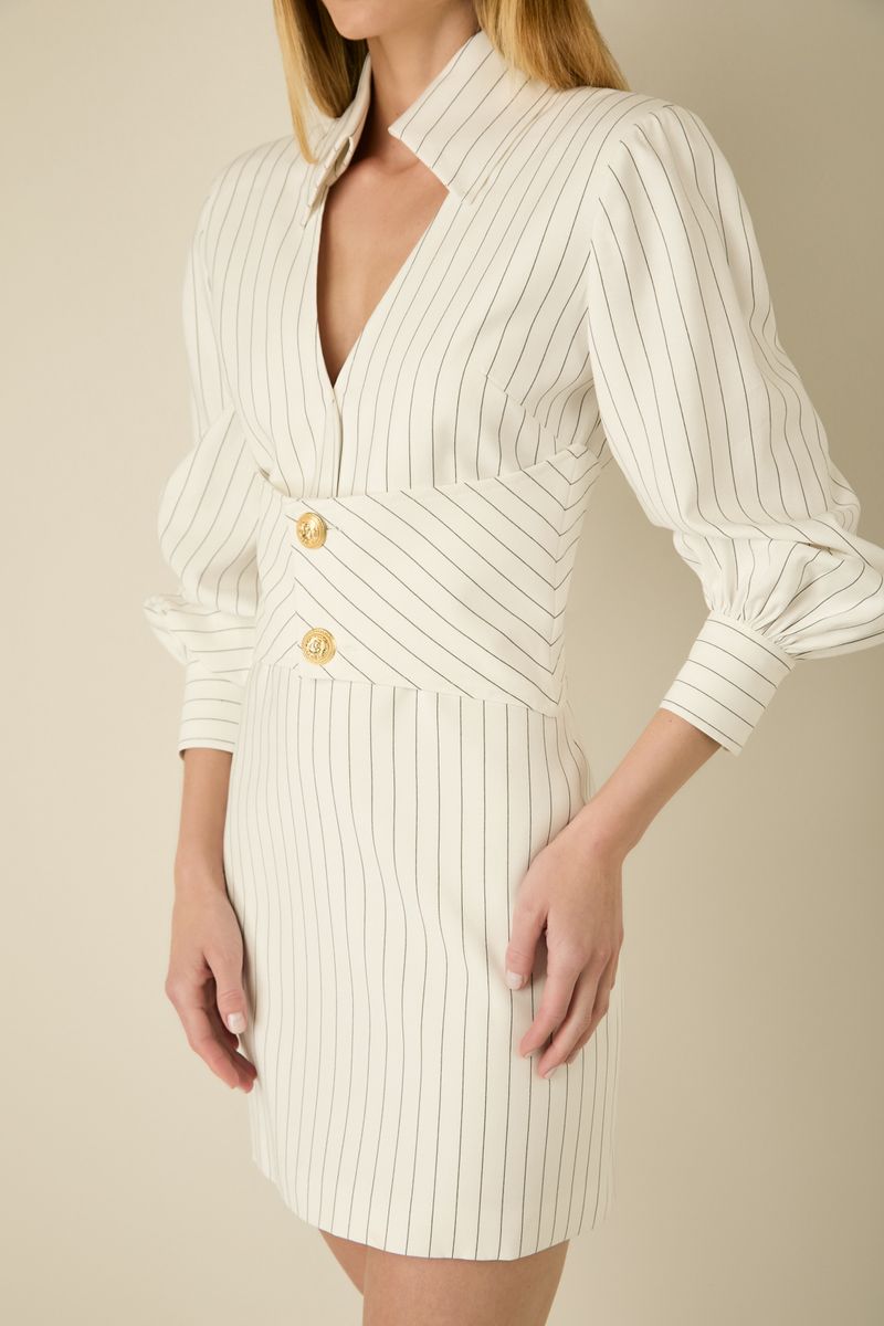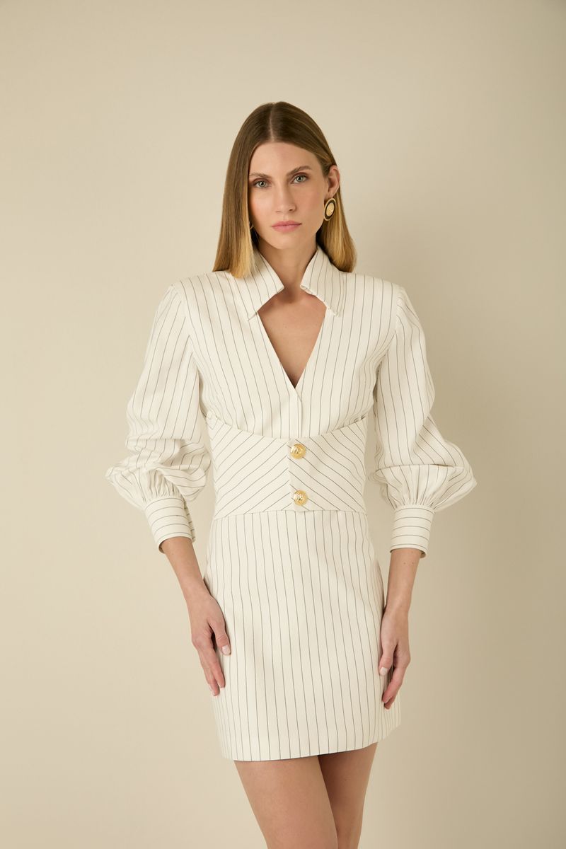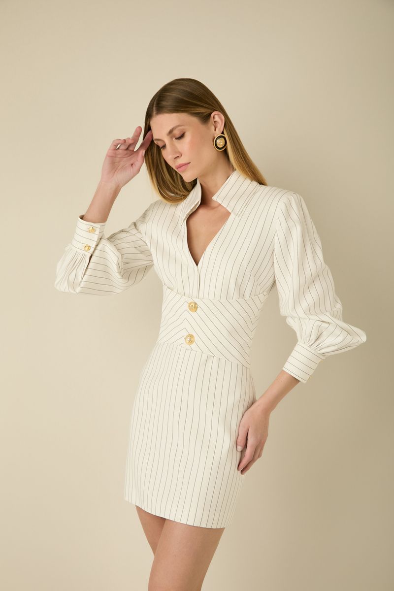 Confeccionado em tecido leve com estampa Navy Stripes, ele apresenta modelagem ajustada que valoriza a silhueta, com recorte estruturado na cintura e botões dourados que adicionam um toque de requinte. As mangas longas bufantes trazem volume e modernidade, enquanto a gola alta com abertura frontal profunda garante um visual elegante e fashionista. Ideal para ocasiões especiais, é uma escolha atemporal que une estilo e personalidade.
